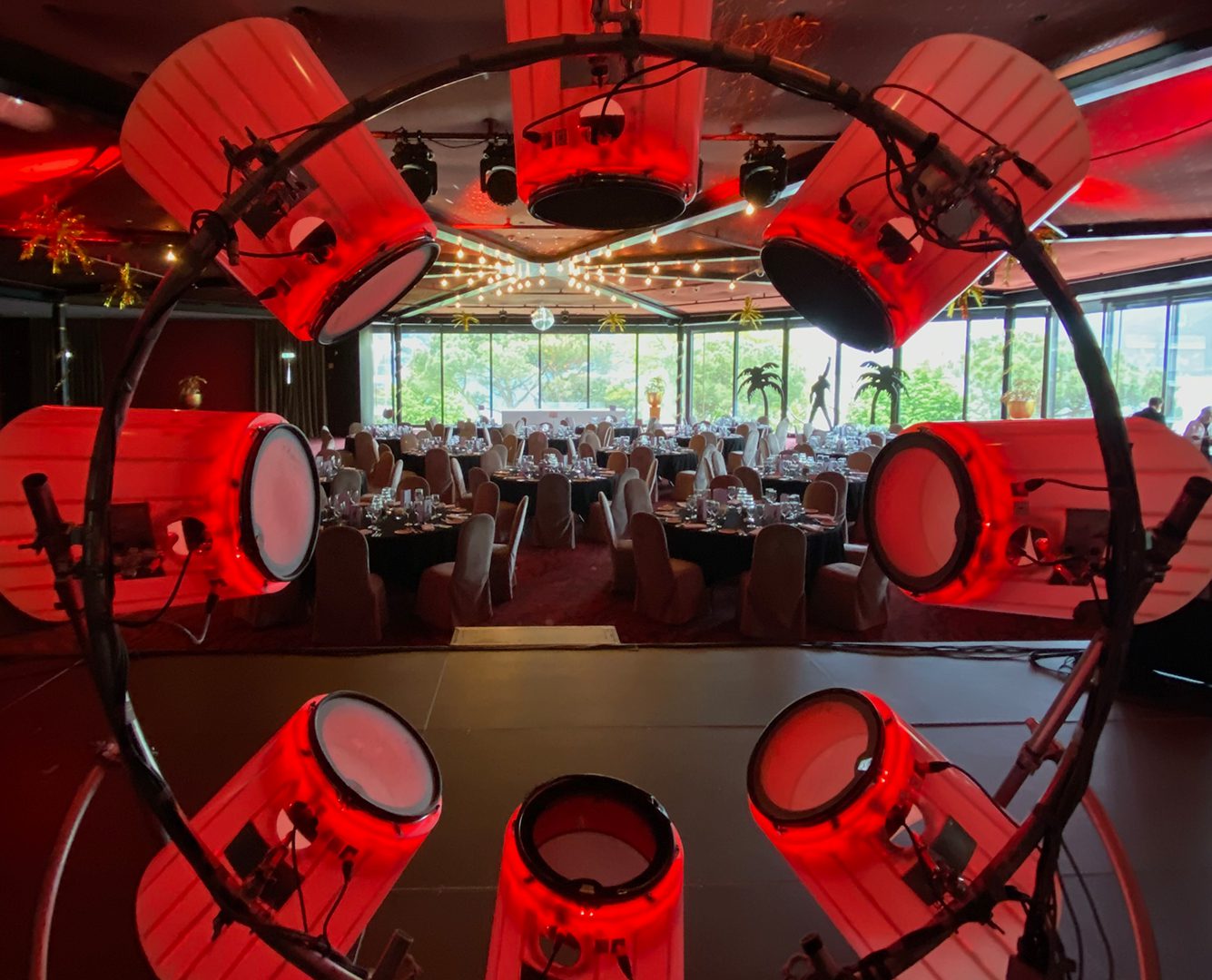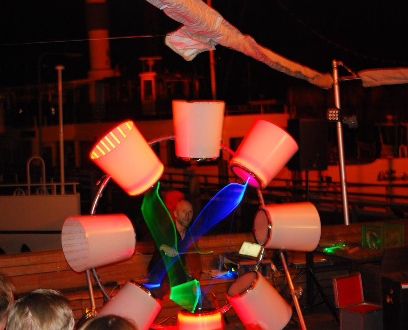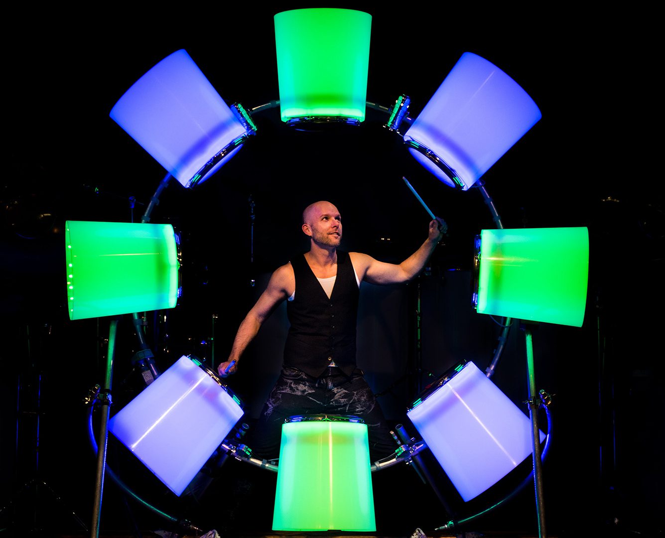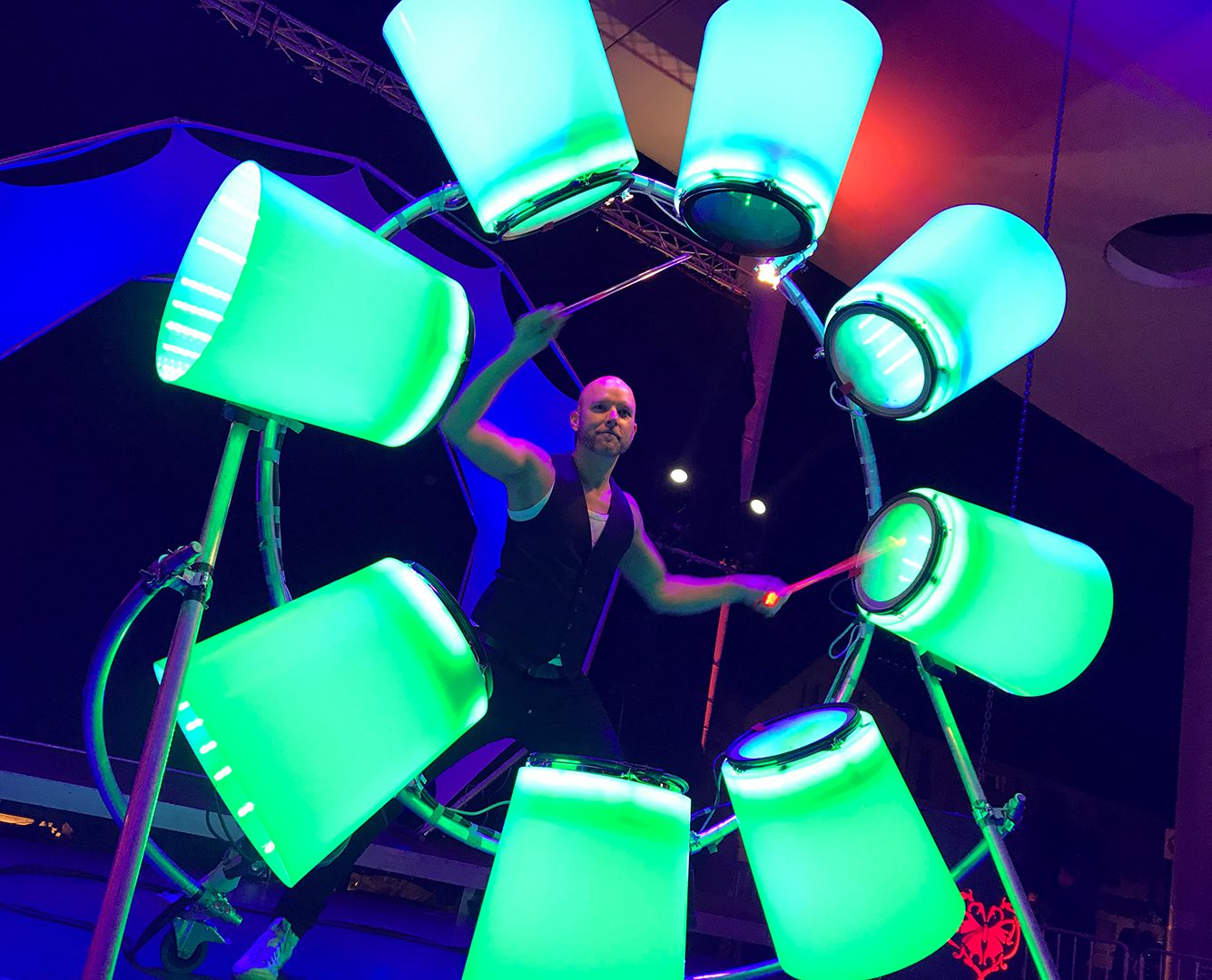 The world's first LED DRUM WHEEL– a spectacular fusion of live drumming and light show. Rudi Bauer creates a dynamic performance where rhythm and light merge in perfect synchronicity – powerful, precise, and virtuosic. It sounds, lights, and captivates – an unforgettable WOW effect for any event. As a stylish light fixture, the LED DRUM WHEEL adds an elegant touch to any stage; in full performance, it creates an explosive sound and light show that enthralls the audience from the very first moment – breathtaking virtuosity for the ears and eyes!